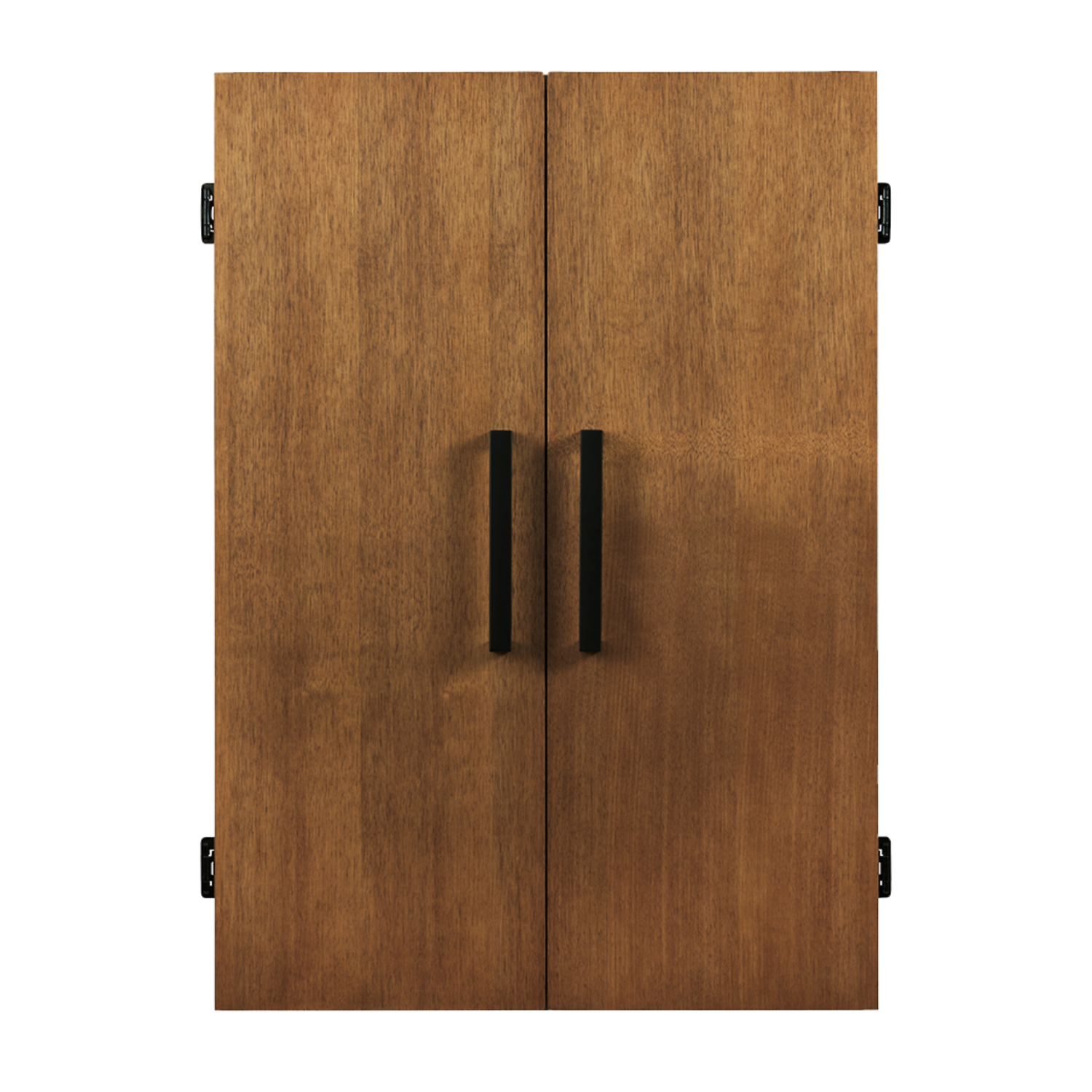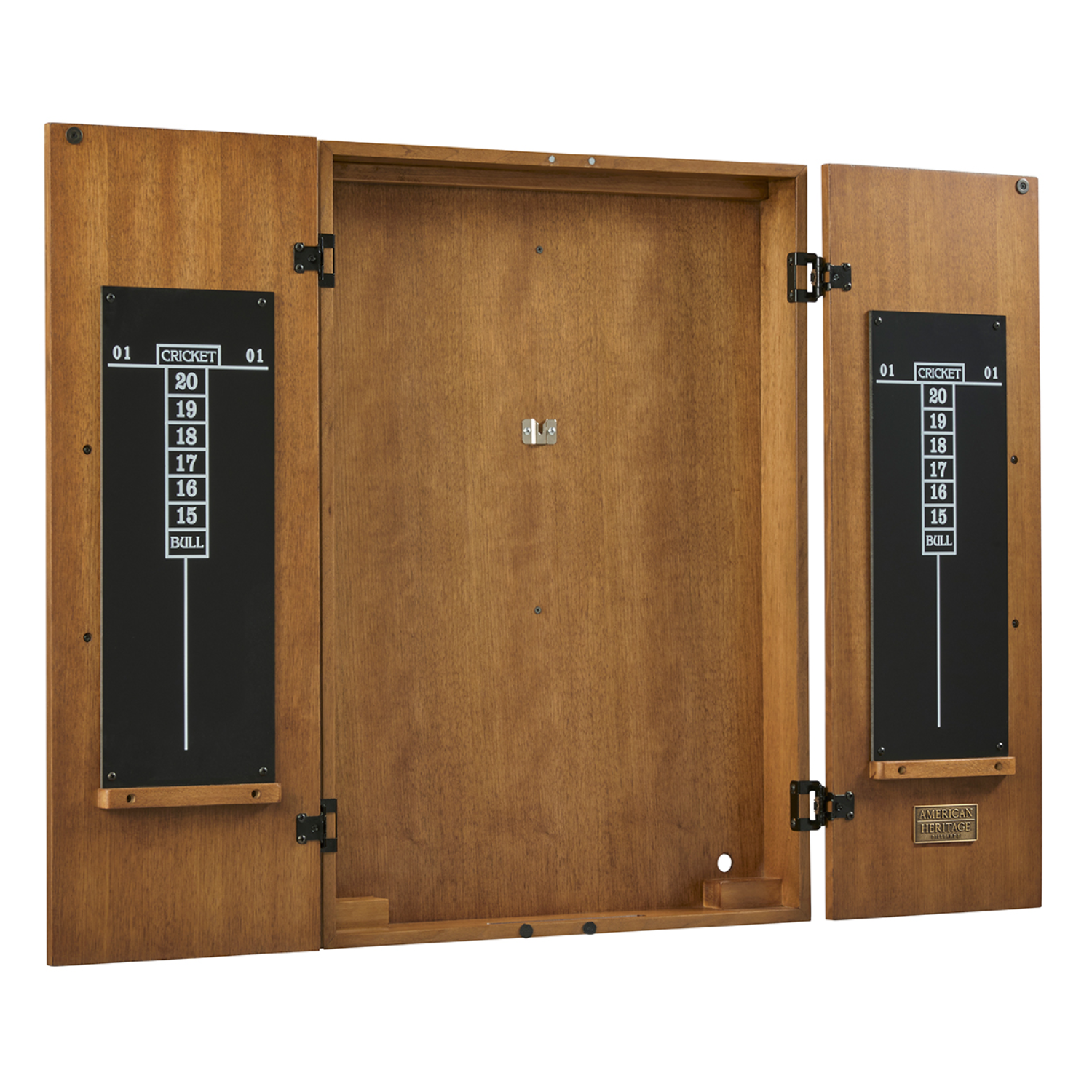 The Alta Dartboard includes a handcrafted cabinet made of walnut with a Brushed Walnut finish. The cabinet is designed to fit two extra sets of darts and large enough to suit both bristle and electronic dartboards depending on your choice (purchase separately). Inside the cabinet are two scoring chalkboards and a bronze American Heritage Billiards nameplate