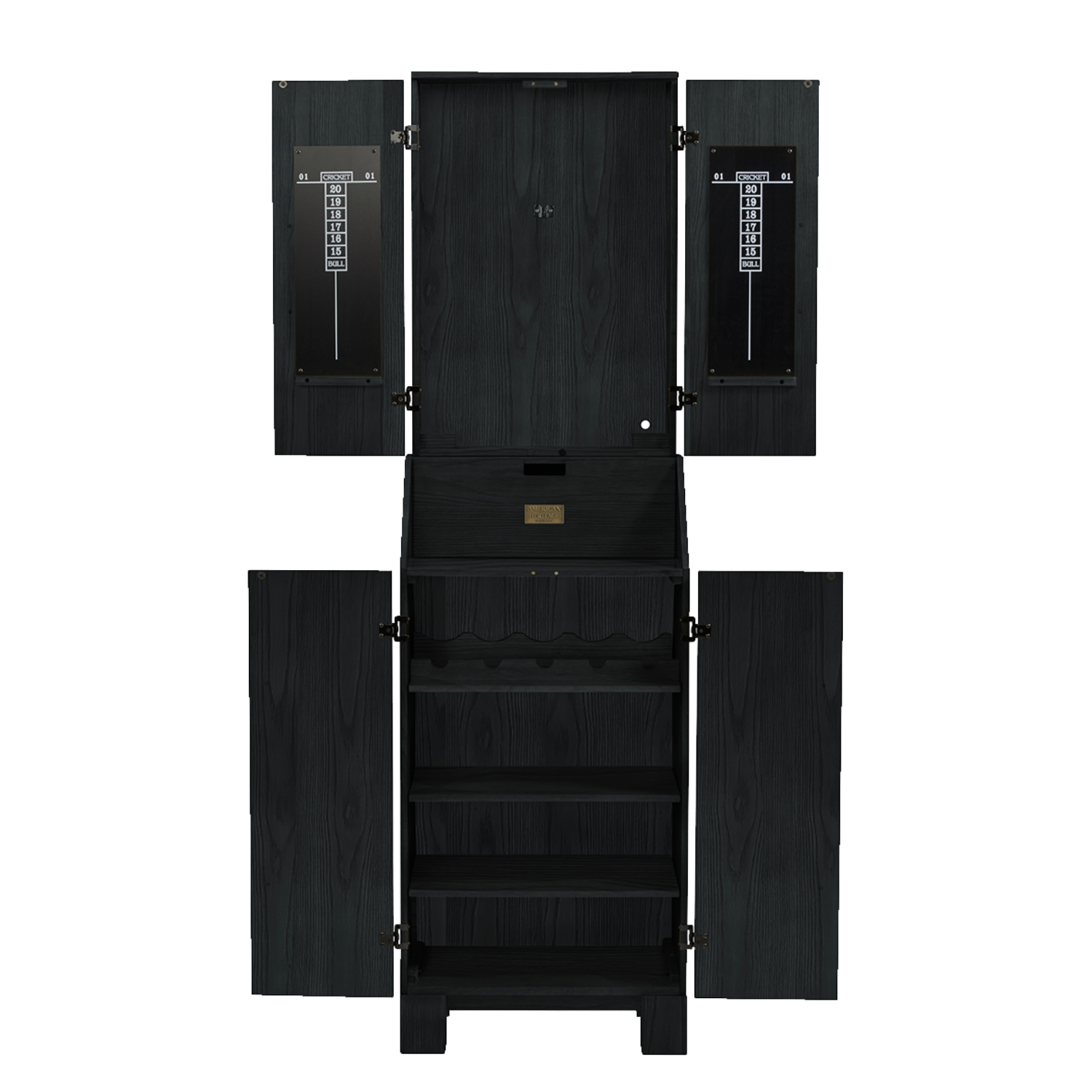 The Alta Standup Dartboard Cabinet is a multi-functional gaming piece for any modern game room. Perfect for home entertainment, game night, serving up cocktails and enjoying time with family and friends. This versatile piece has plenty of storage with a five-bottle wine rack and two adjustable storage shelves for glassware, cocktail ingredients and extra games. The cabinet is large enough for both tournament size bristle and electronic dartboards.