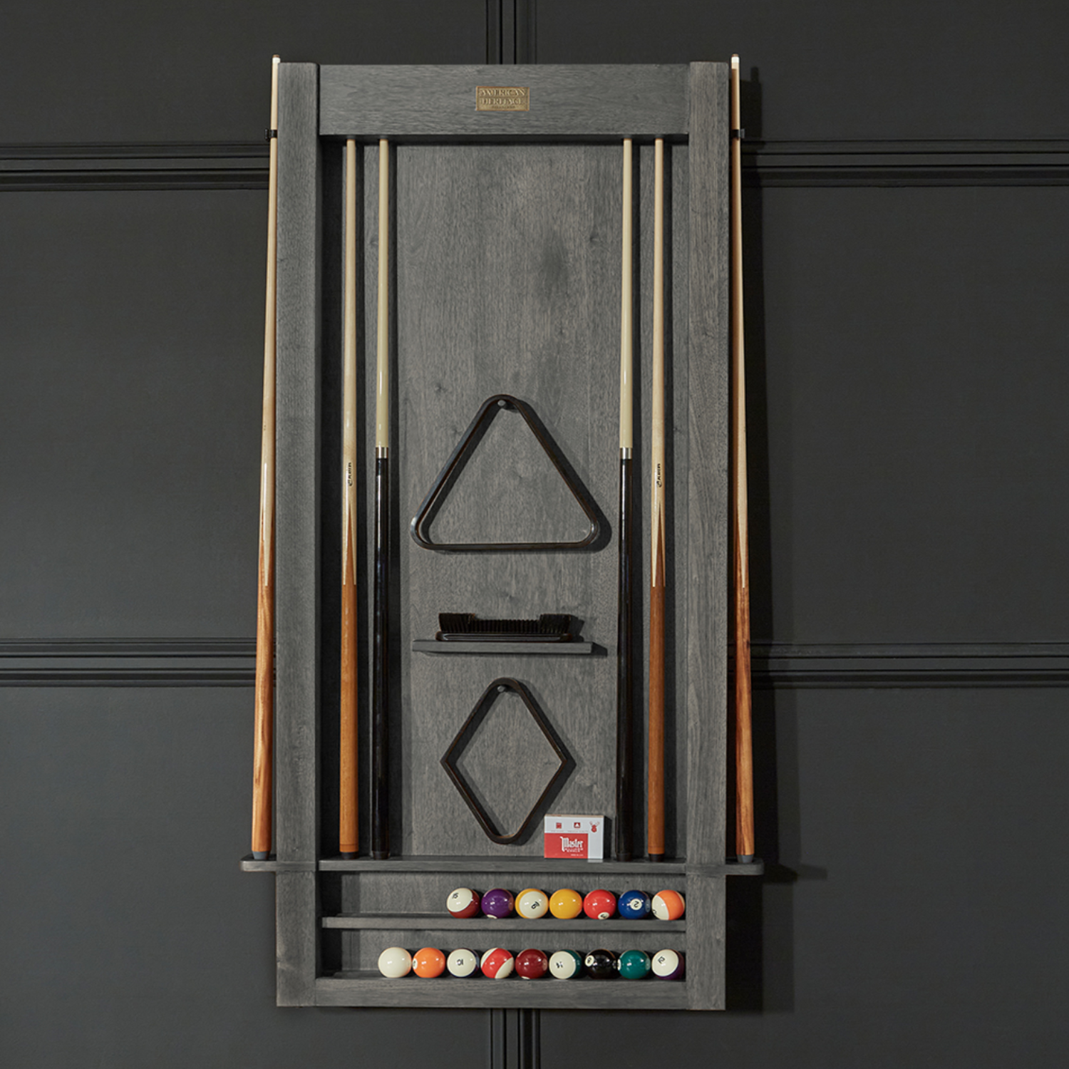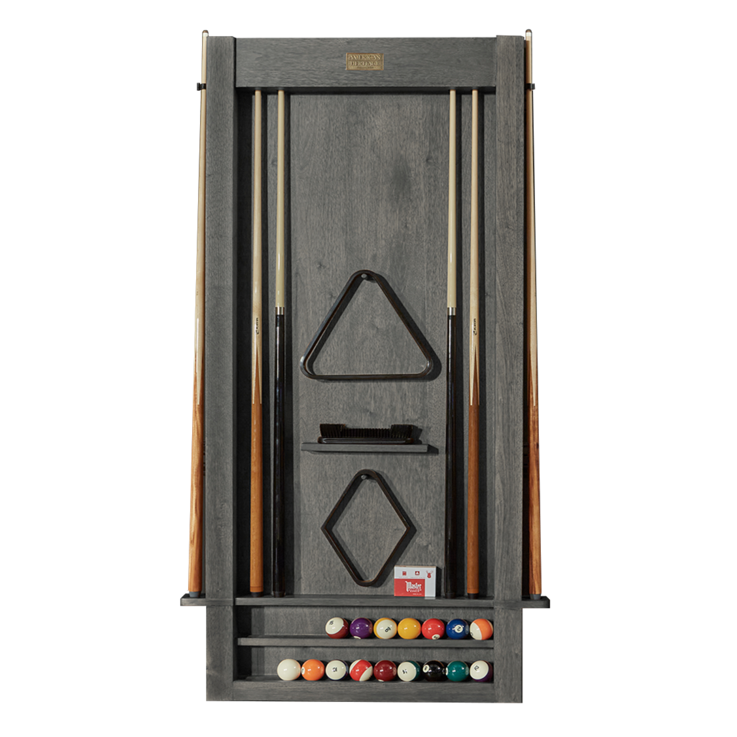 The Alta Wall mounted Cue Rack holes up to 6 cues along with everything you need for the perfect billiard game: racks, balls, brushes, chalk, and any other billiard accessories you prefer with room to spare.