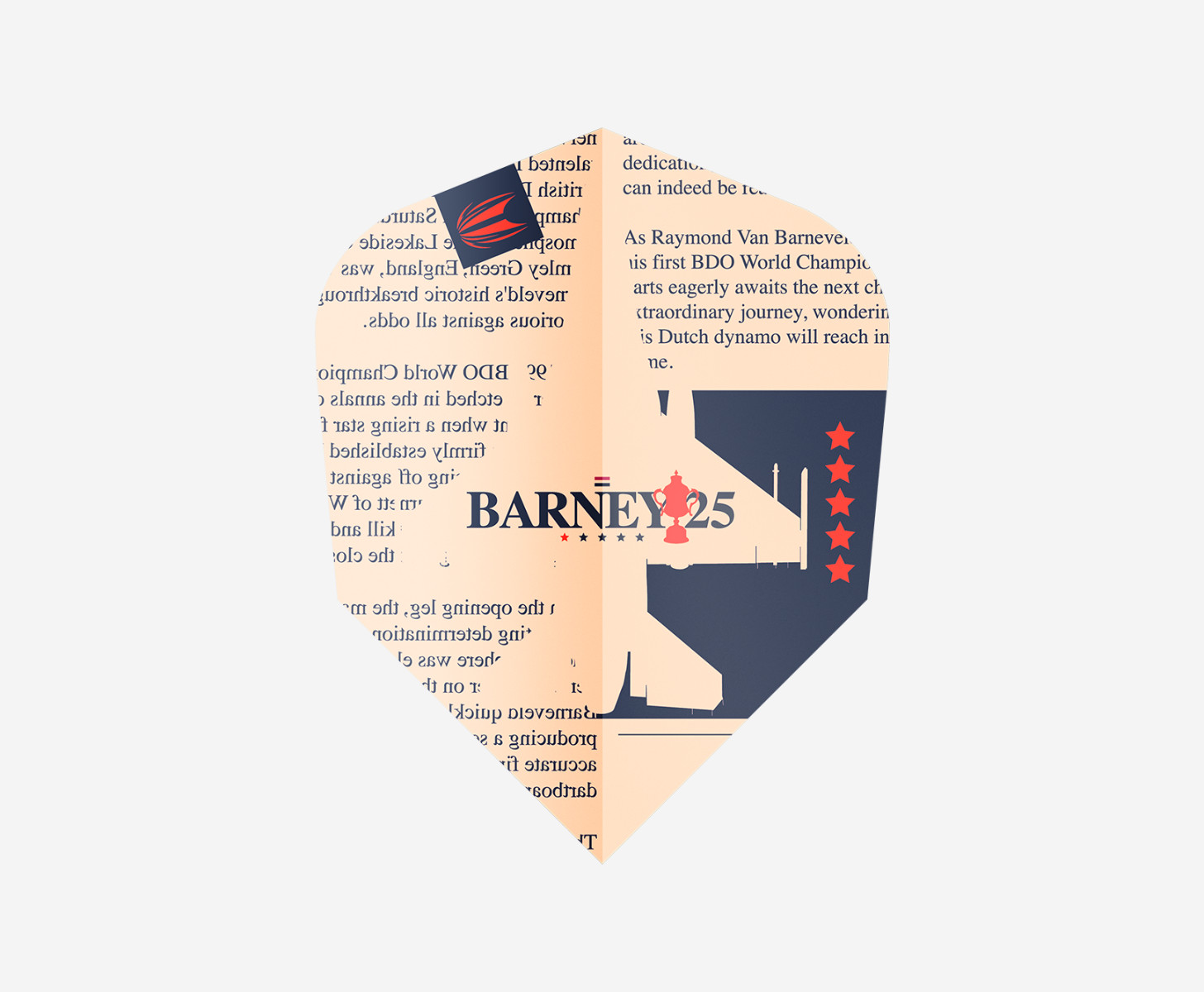 Designed in collaboration with the World Champion, Raymond van Barneveld, to celebrate the 25th anniversary since his first World Championship win. Created with a spot UV print to improve flight to shaft grip, the 100-micron flight is extra durable and the perfect addition to the BARNEY25 darts.