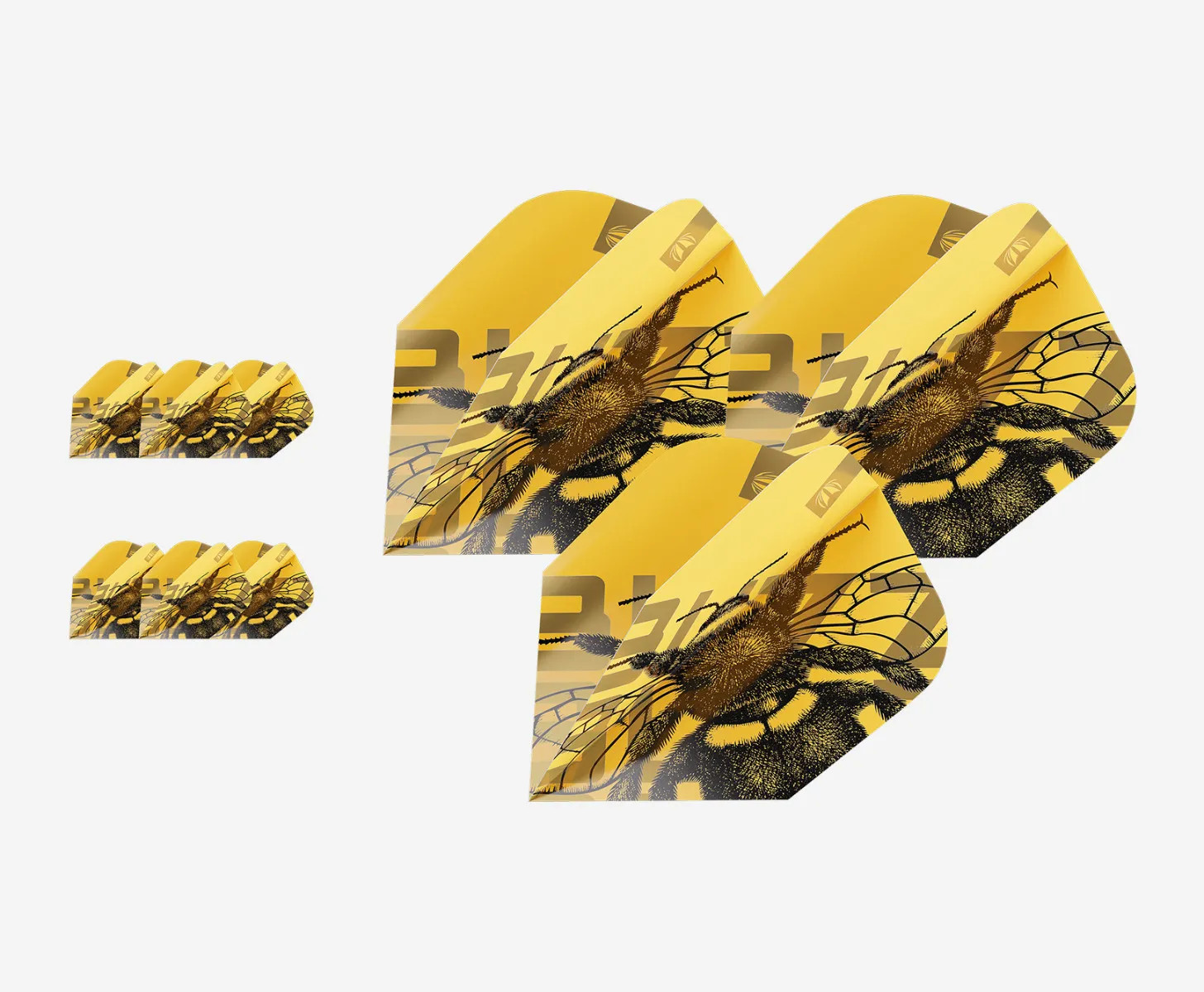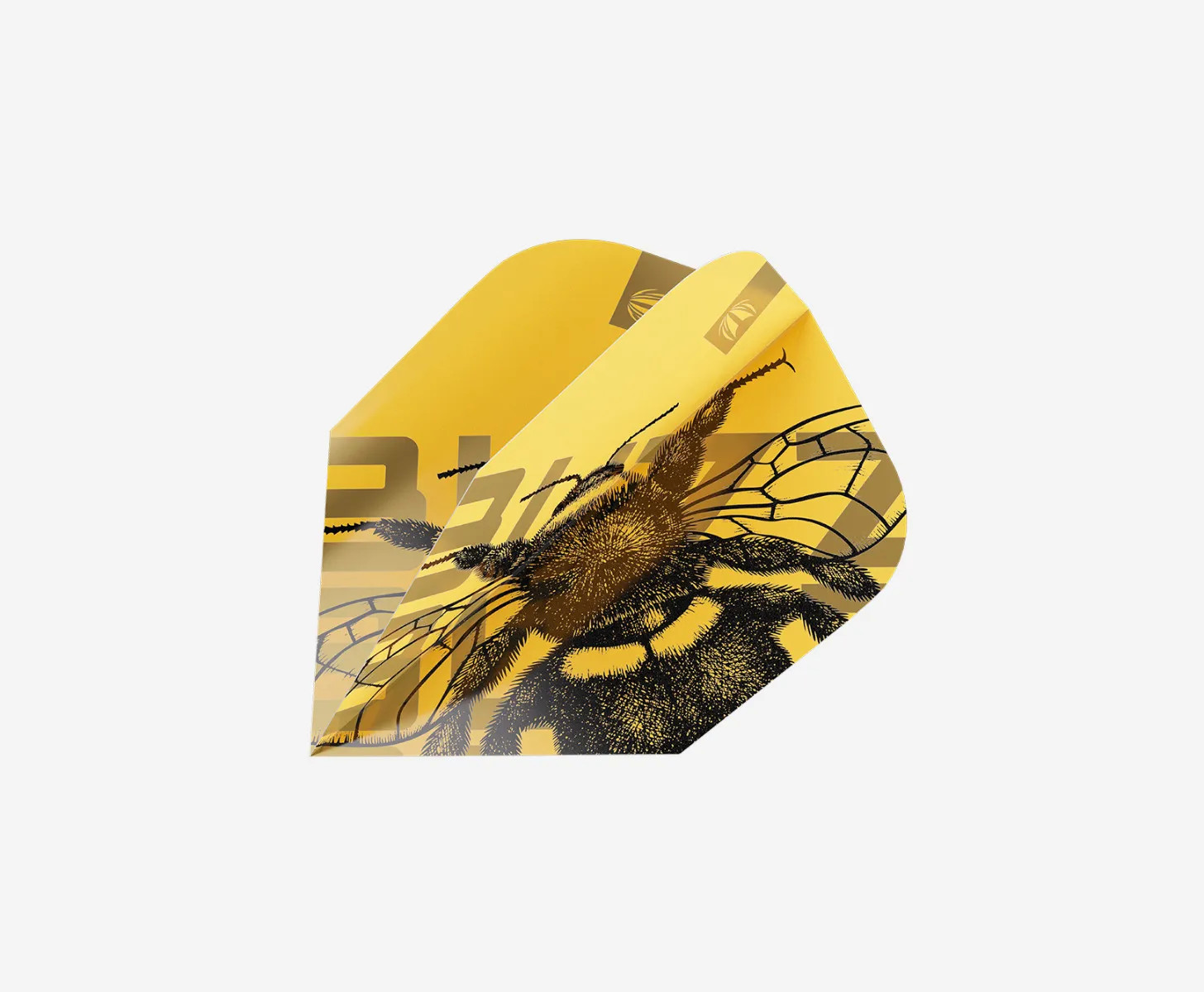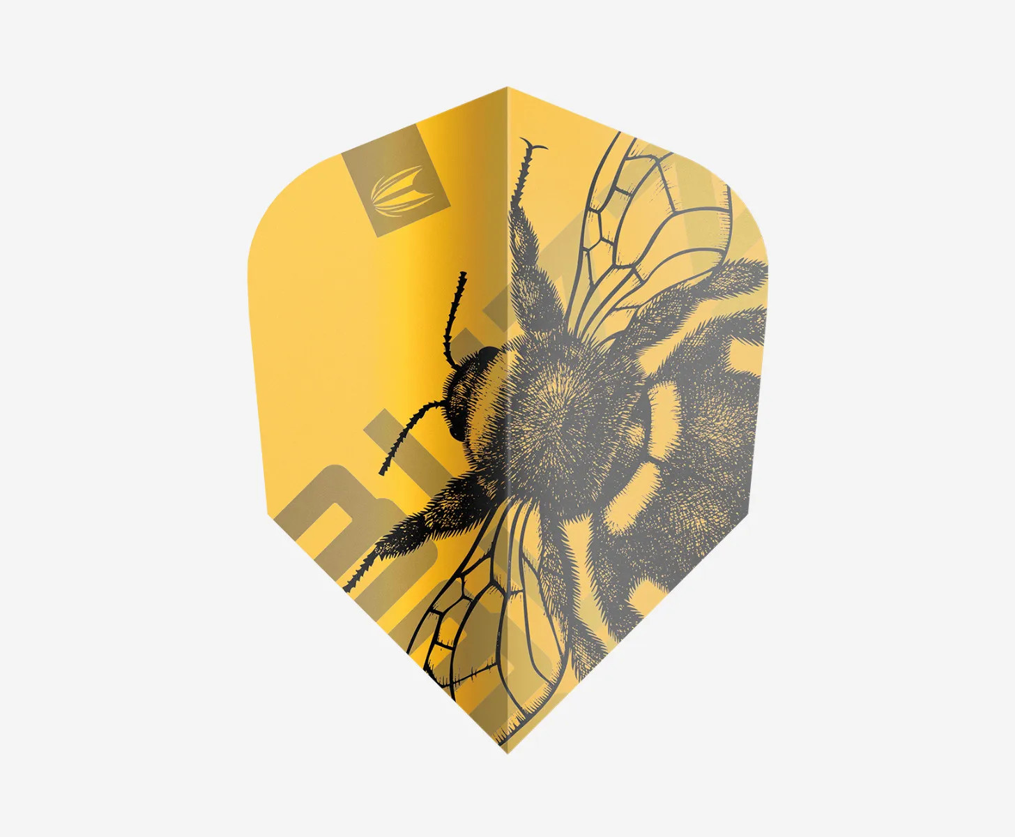 The Buzz dart flights created as part of the Ento range, inspired by the intricate beauty of bees, featuring a bold, honey-yellow backdrop adorned with a vibrant bee design.