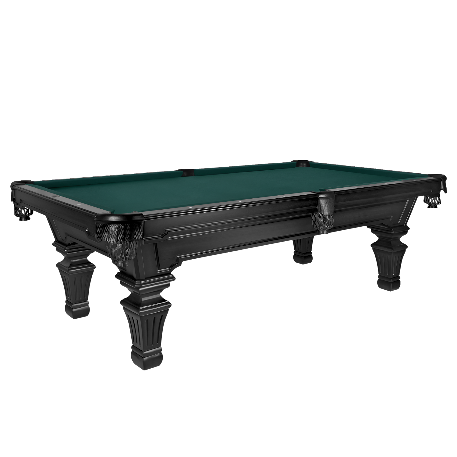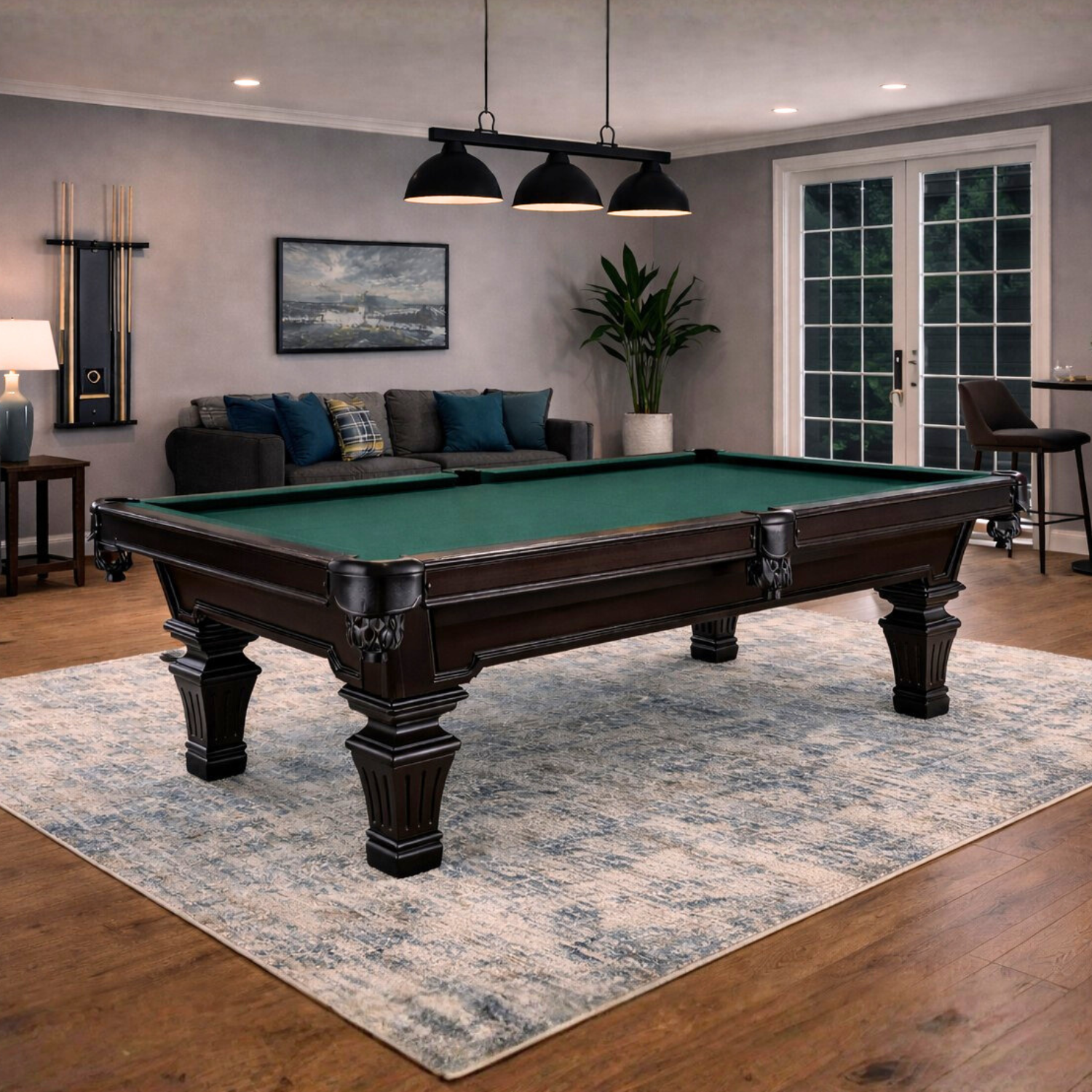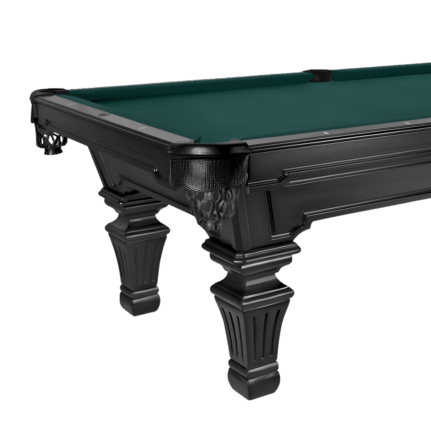 The Colonial pool table embodies a grand, stately aesthetic with intricate carvings that enrich both the legs and frame. Its fluted, tapered legs and layered panel detailing create a striking architectural statement, while the routered panel cabinet design adds dimension and craftsmanship throughout. Raised molding and refined trim along the apron enhance its depth and sophistication. Finished with classic leather drop pockets, the Colonial exudes timeless, old-world luxury. Crafted from solid wood, this table is built to deliver both enduring beauty and lasting performance.