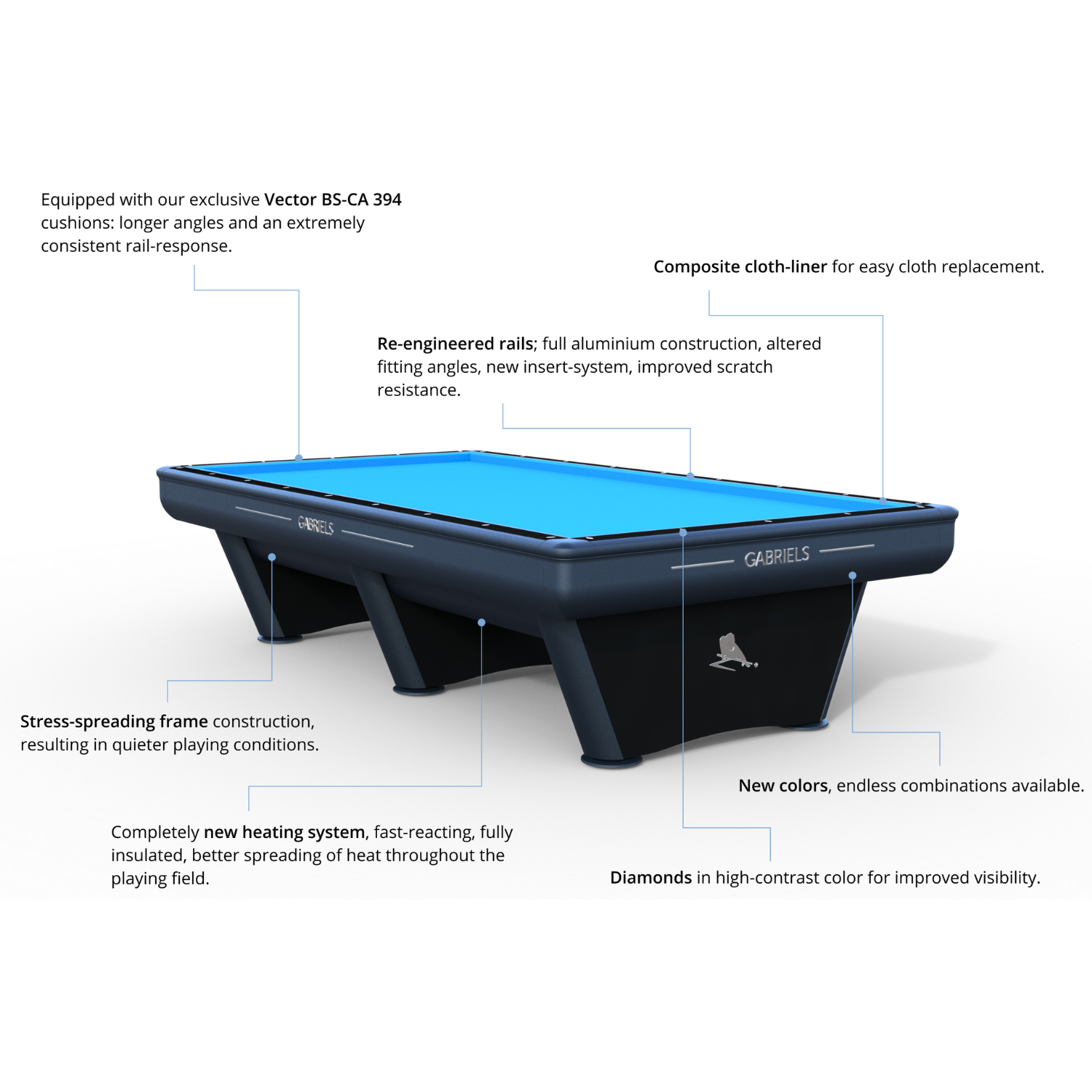 - Advanced Rail System: Redesigned aluminum rails with improved angle and Vector BS394 cushions for superior accuracy and speed.