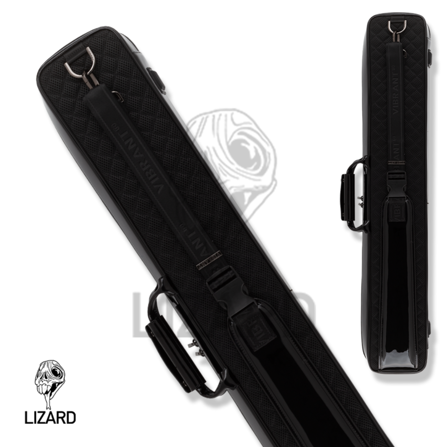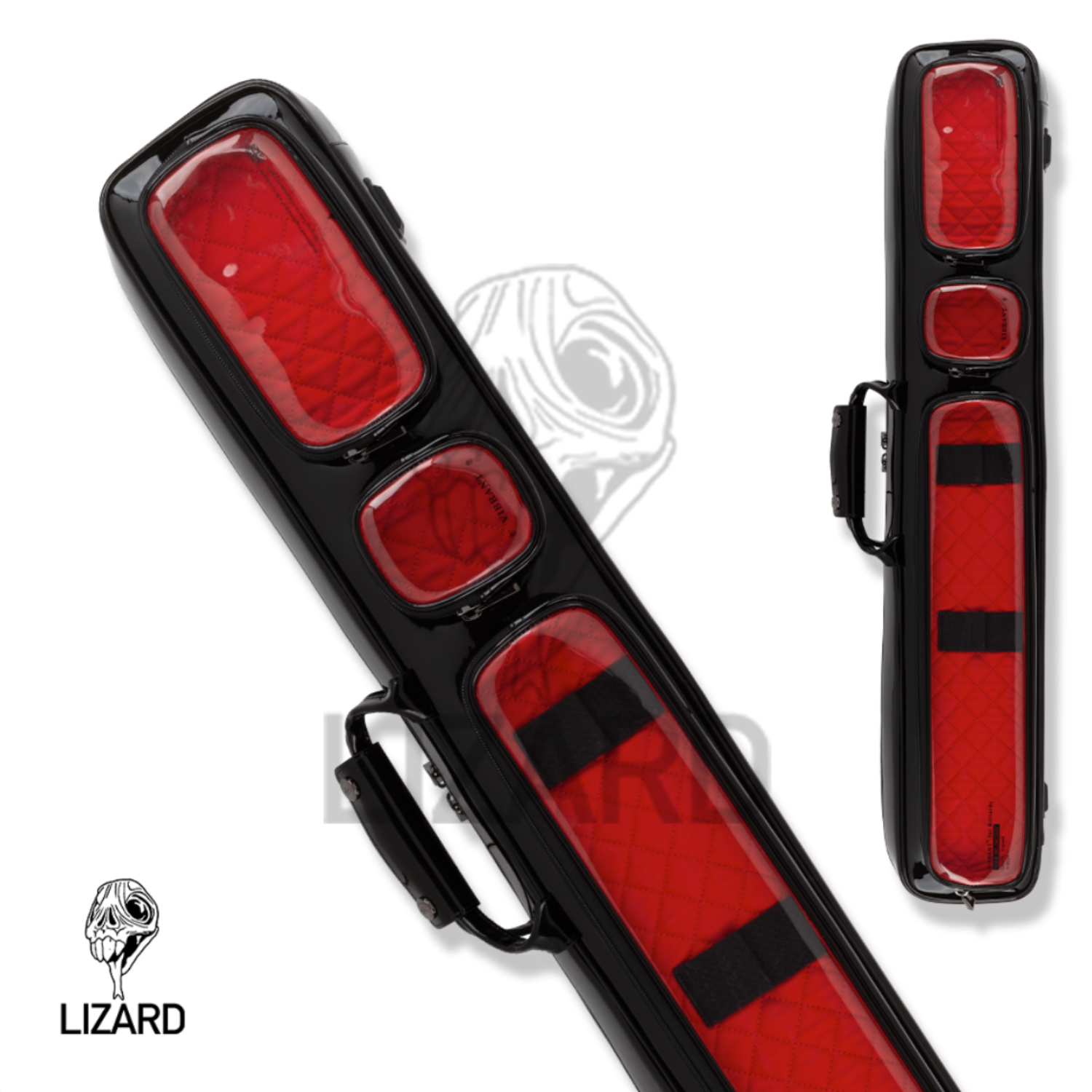 This Lizard soft cue case comes in a black shiny vinyl with see-through pockets and a red interior, and can hold 3 butts and 5 shafts. It has an adjustable shoulder strap and a side carrying handle making it easy to transport, and has more than enough pockets for your accessories.