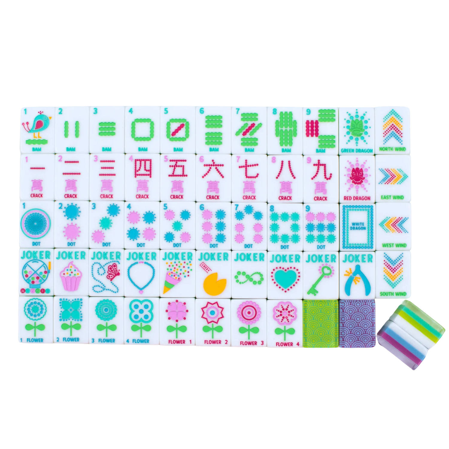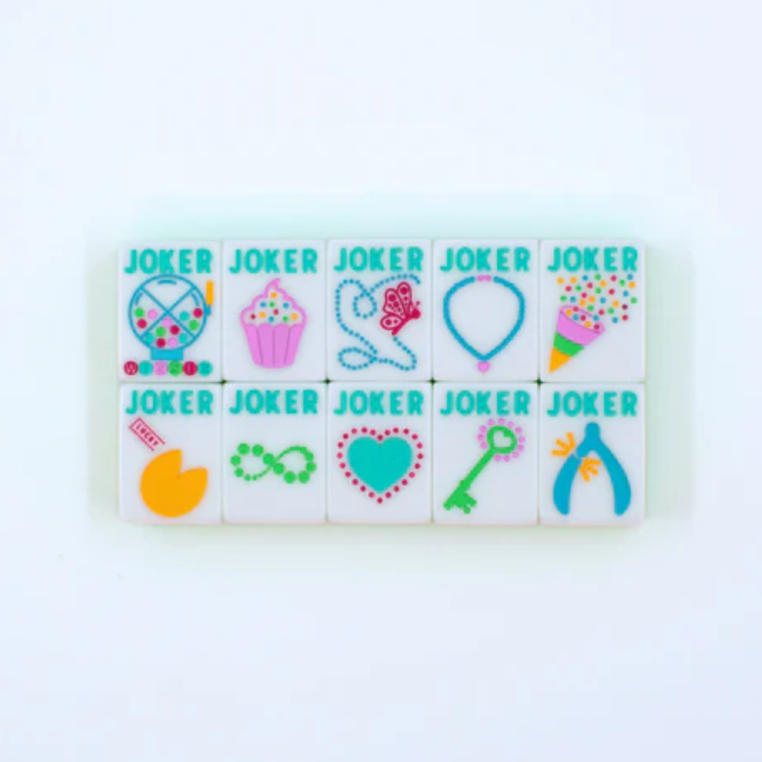 Introducing the Confetti Series Tile Set in Lemon-Lime Green. Mahjong with a Sprinkle of Color and Joy. This set features labeled tiles for ease of play, making it an incredible set to teach with and excellent for players wanting a touch of whimsy, but who appreciate clear tile identification! This set is delightfully chunky and includes designs that are whimsical and confetti-inspired in nature, with little celebrations and nods throughout the set.