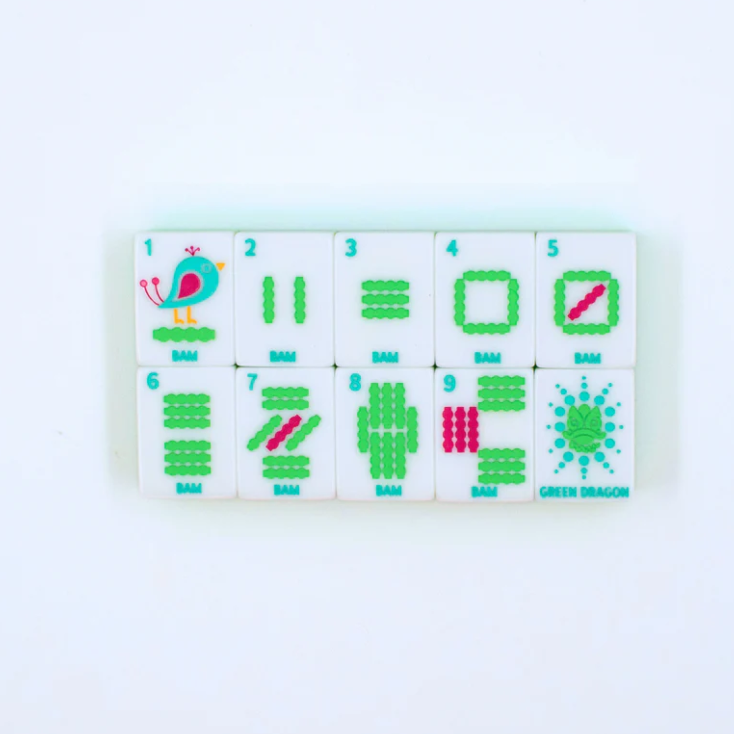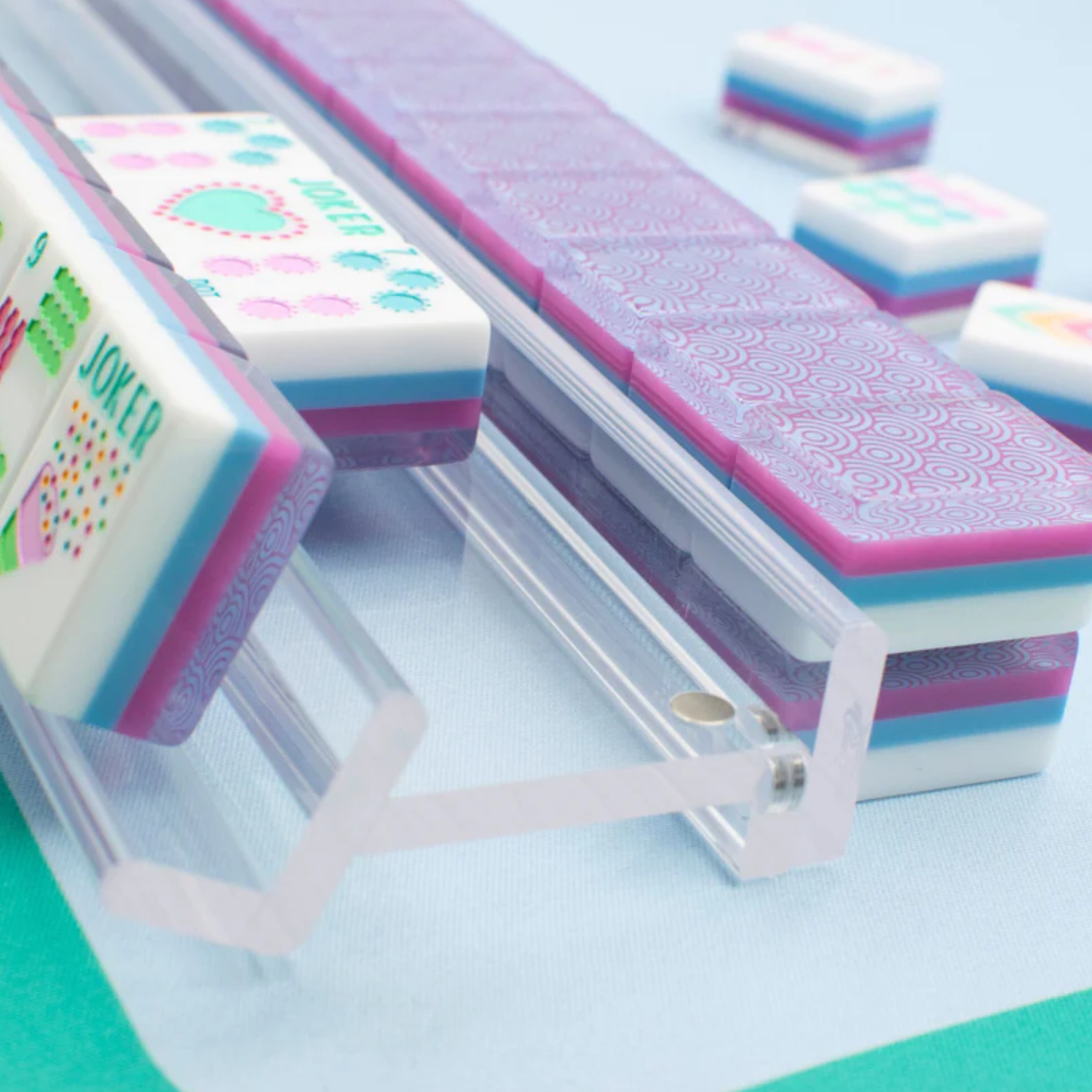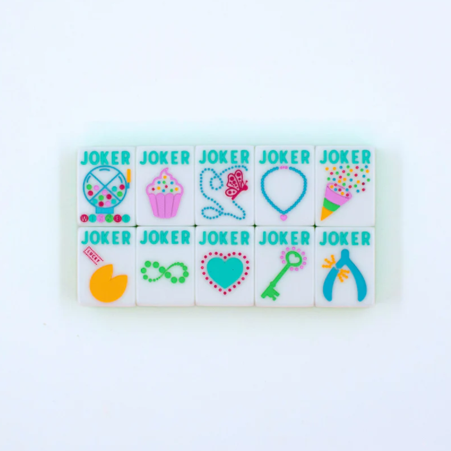 Introducing the Confetti Series Tile Set in Confetti-Purple. Mahjong with a Sprinkle of Color and Joy. This set features labeled tiles for ease of play, making it an incredible set to teach with and excellent for players wanting a touch of whimsy, but who appreciate clear tile identification! This set is delightfully chunky and includes designs that are whimsical and confetti-inspired in nature, with little celebrations and nods throughout the set.