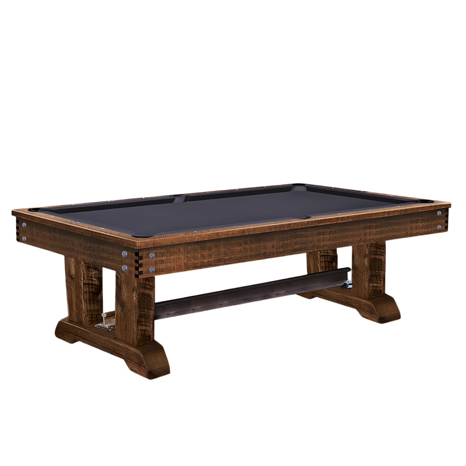 The Midland Rustic Brown Pool Table features a striking trestle-style base crafted from a section of decommissioned railroad rail paired with reclaimed hardwood crosstie timbers. Sourced during the course of operating a railroad maintenance business, these materials are reimagined for historic preservation and sustainability, giving each table a unique story.