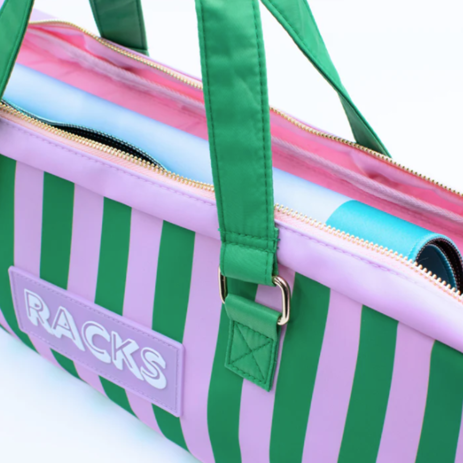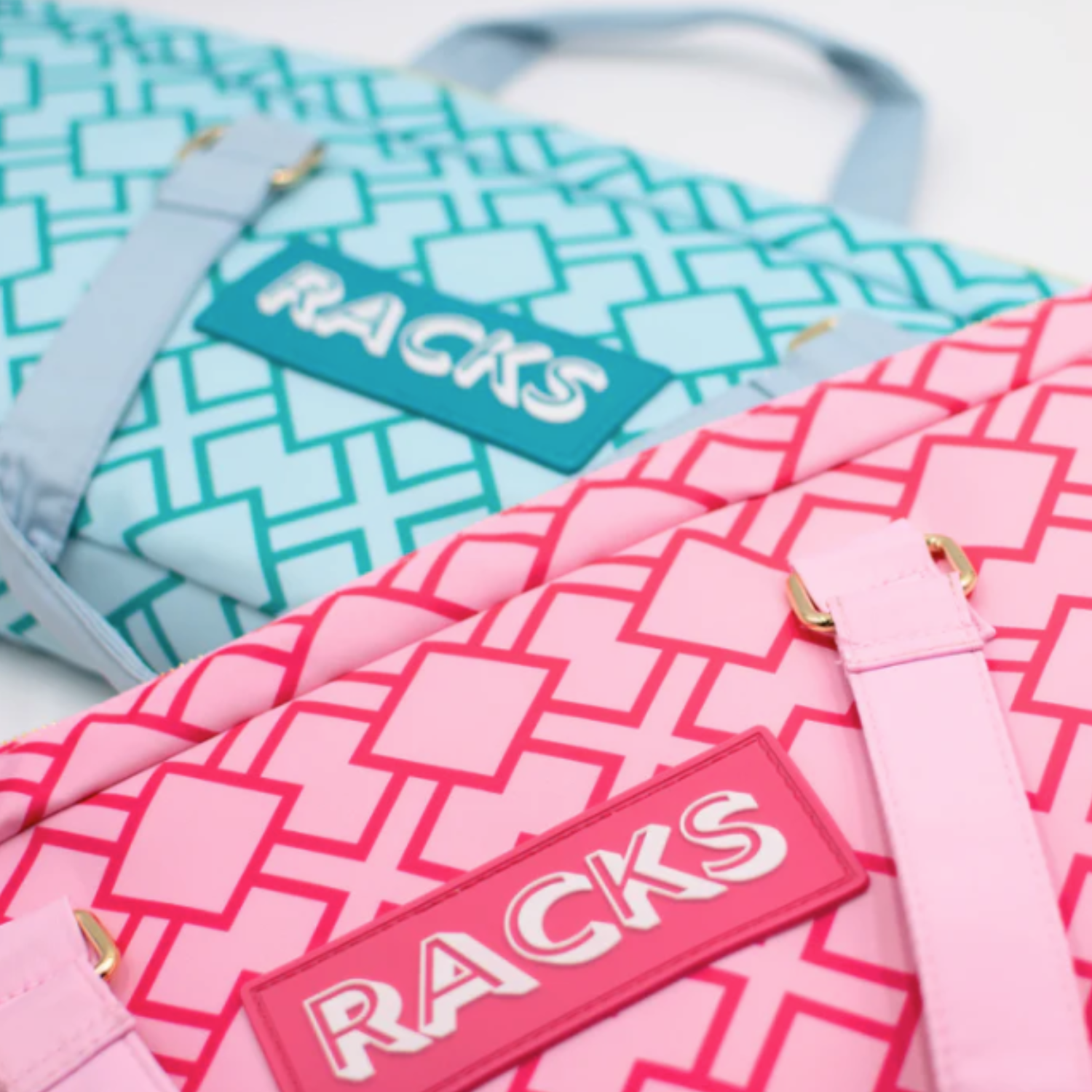 - Full zipped Rack Bag with a sewn-on rubber patch that says "Racks"