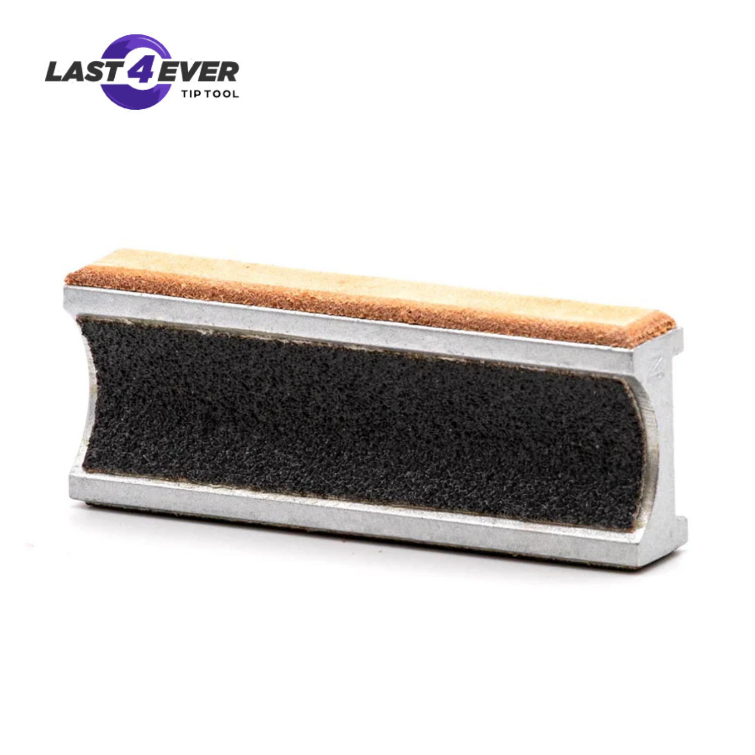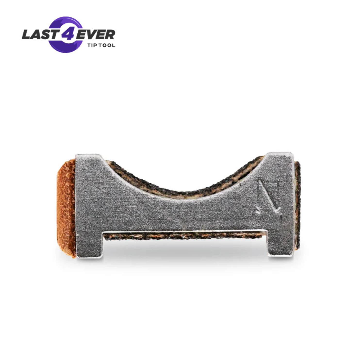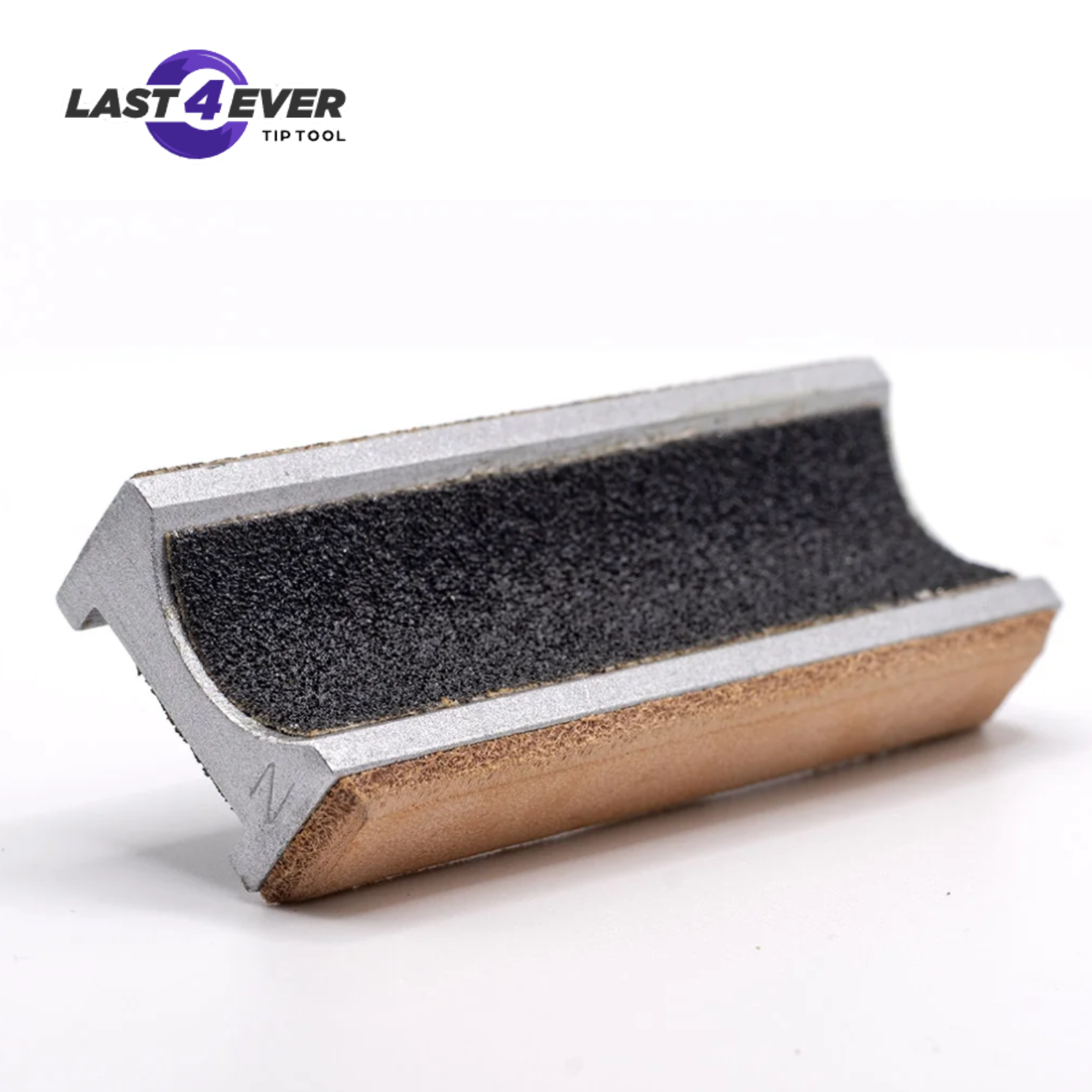 The Original 4 way Last4Ever Tip Tool where each side of the tool has a specific function. A radius side to shape or reshape tip radius, a recessed flat side to scuff tip without removing any leather material (recessed so it will not scratch furniture), an abrasive edge for mushroom repair, and a leather edge for tip burnishing.